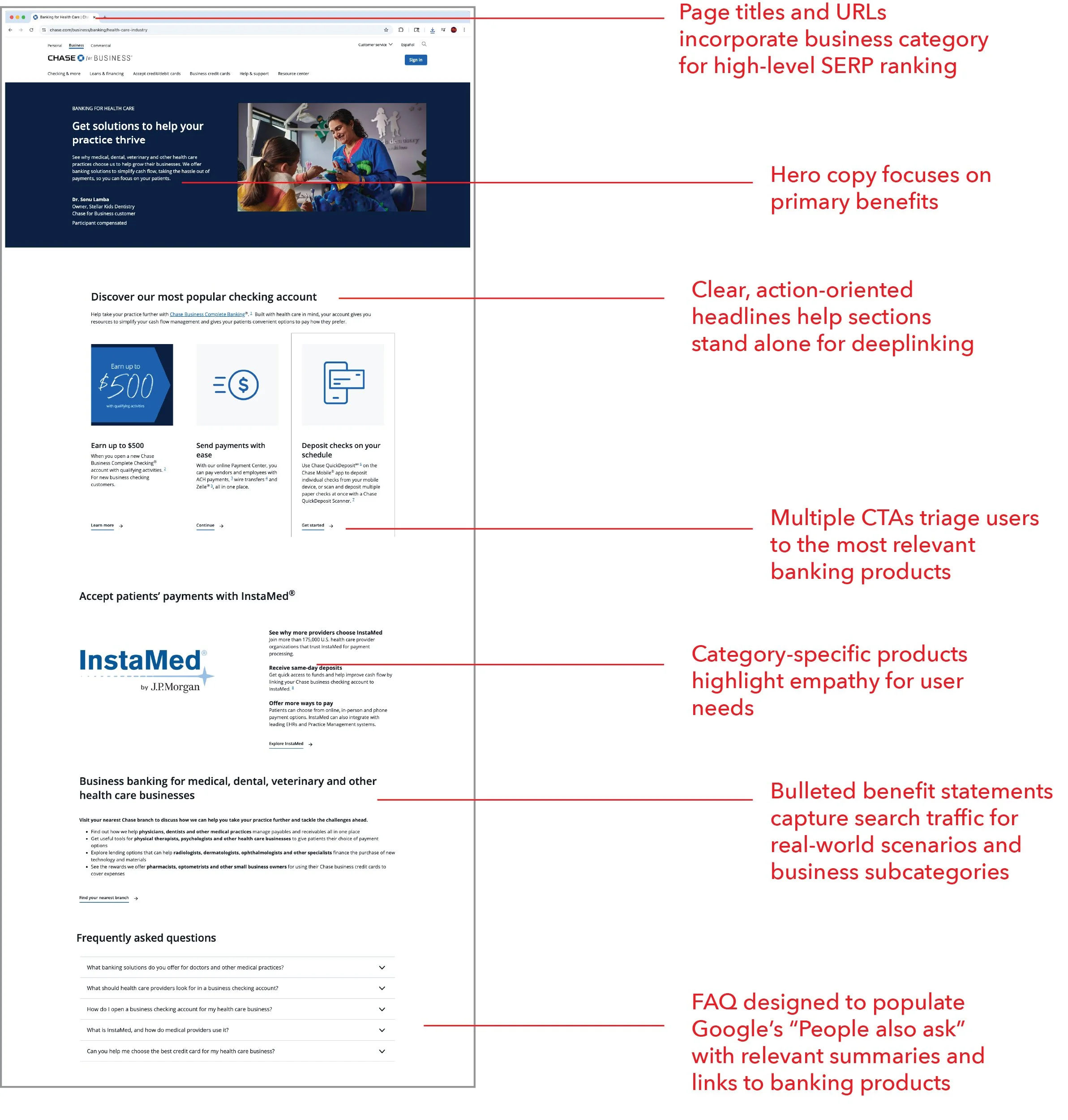 Chase Bank is known for its massive scale, but their Chase for Business division also caters to the unique needs of small businesses like professional services firms, healthcare clinics, wholesalers and contractors. To reach these business owners, Chase needed a series of targeted landing pages, powered by an SEO and content strategy that could generate search traffic from business owners looking for a bank that gets them.